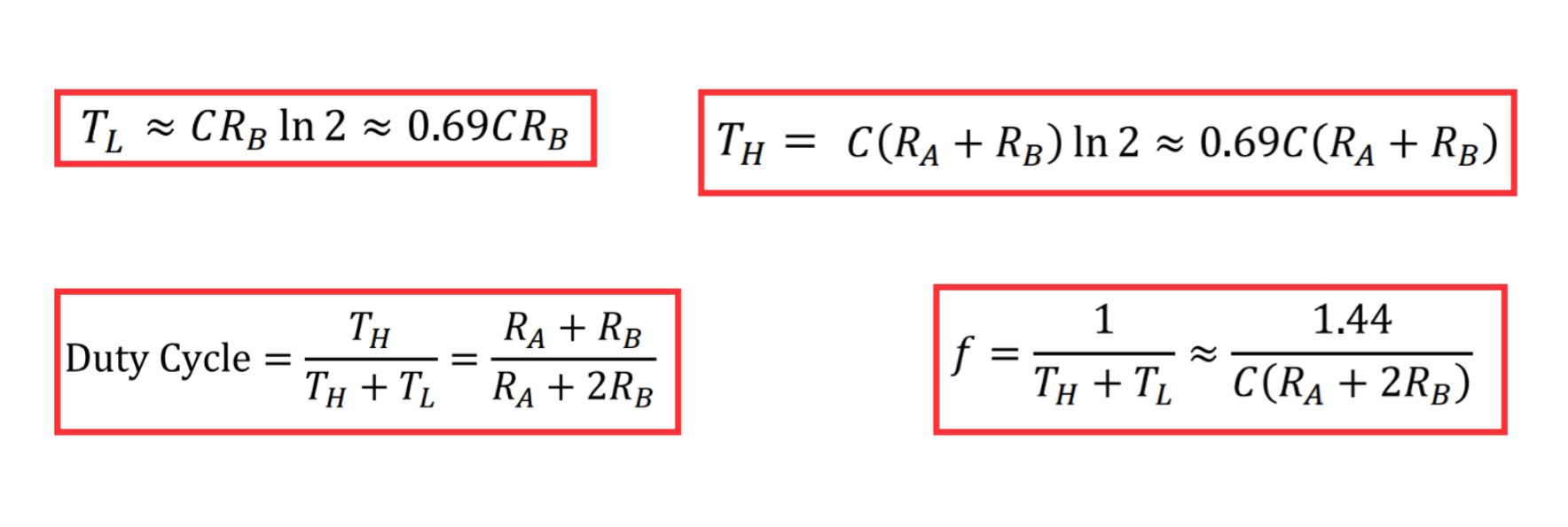 Figure 3: Equations describing parameters of 555 timer based on components, sourced from [1].