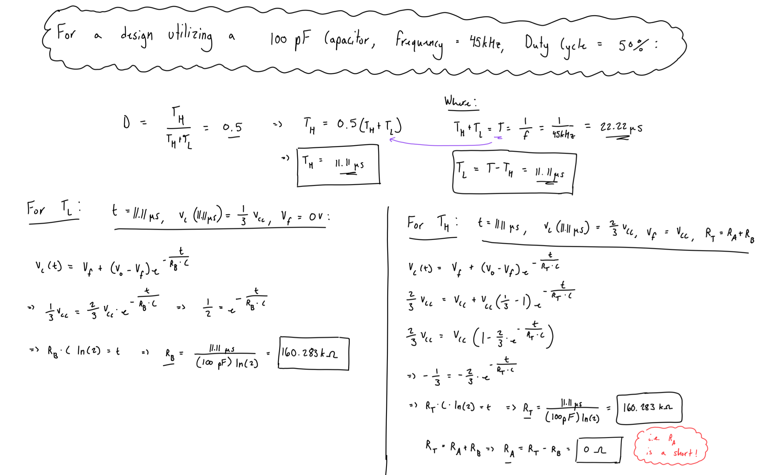 The output behavior (Vo) of a 555 timer can be expressed through the following four parameters: Frequency (f), which represents the number of times per second the waveform completes a period, Duty Cycle (D), which represents the ratio of the amount of time the output is high divided by one period of the waveform, Time High (TH), which represents the amount of time that the waveform is high over a period, and Time Low (TL), which represents the amount of time that the waveform is low over a period. An example of the analysis used to determine the resistors (RA & RB) needed for a 555 timer operating in astable mode, changing at a frequency of 45kHz, a duty cycle of 50%, utilizing a 100pF capacitor is shown below (Figure 2):