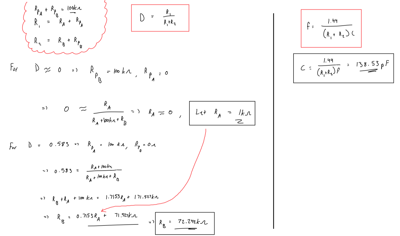 To achieve the maximum switching speed and duty cycle found above, I knew that the 555 timer configuration would have to yield a duty cycle ranging from ~0 to 0.583 at a frequency of 60kHz. To accomplish the variability of duty cycle, a potentiometer was used to adjust the RA and RB values such that when fully rotated clockwise, the maximum duty cycle of ~0.583 is achieved and when fully rotated counterclockwise, the minimum duty cycle of ~0 would be achieved. To determine the corresponding values needed to get this duty cycle range and frequency, the equations from Figure 4 were used to calculate appropriate resistor and capacitor values. The calculations for this are shown in the figure below (Figure 12):