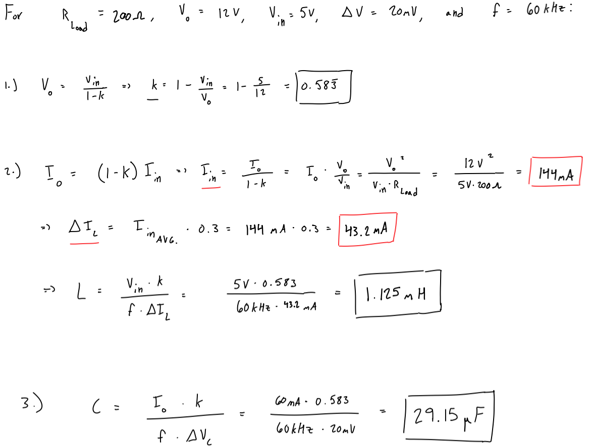 For this project, I wanted to design a buck converter that could supply a 200Ω load at a maximum output voltage of 12V with a ripple voltage < 1.7% (20mV), given an input voltage of 5V and a switching frequency of 60kHz. The input and output parameters for this were chosen arbitrarily, but these values are typical for a power boost converter. To achieve the design for this, design calculations had to be performed to determine the proper inductor, capacitor, and ripple values. To achieve an output voltage of 12V, an equation relating output voltage to input voltage and duty cycle was used. For an input voltage of 5V and an output of 12V, it was determined that a duty of 0.583 would achieve this voltage output. At an output voltage of 12V and a load of 200Ω, the average output current would be 60mA, and via the previously found duty cycle and a formula relating output current to input current and duty cycle, it was found that at an output of 12V, the input current would be 144mA. To deal with some of the nasty effects that can come with a small inductor ripple current while also keeping a good compromise on inductor sizing, the decision was made to design for a ripple current of 30% of the average input current (read more on that here: https://www.analog.com/en/resources/technical-articles/selecting-the-right-inductor-current-ripple.html). This yielded a ripple current of ~43mA. Based on the ripple current, input voltage, duty cycle, and switching frequency, the inductance needed to have these values was an inductor of 1.125mH. To achieve a ripple voltage of 20 mV, a calculation was performed using a formula that relates the required capacitance to the specified output current, duty cycle, frequency, and ripple voltage. This yielded a capacitor value of 29.15μF. The calculations and formulas used in these calculations can be seen below (Figure 7):