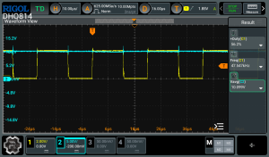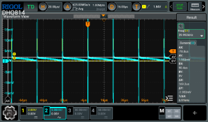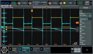 - Figure 17: Output waveform of converter at a duty cycle of 1.5% (blue) and the pulse output of 555 timer (yellow).