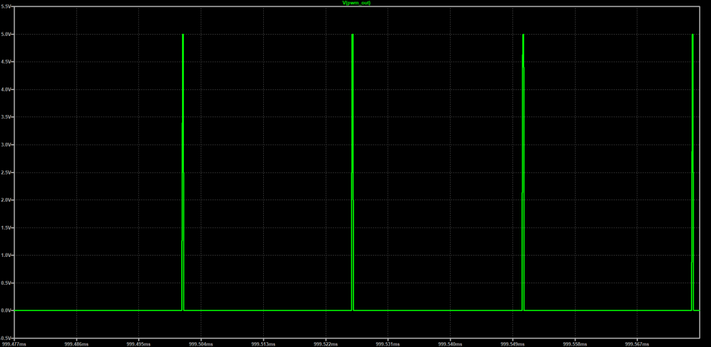 To verify the performance of the circuit that I created, I captured the waveforms of the output voltage of the 555 timer segment of the circuit and the output voltage of the boost converter portion corresponding to the minimum and maximum duty cycles of the 555 timer. The input voltage for the circuit was 5V and at a duty cycle of ~1.5%, the measured output voltage was around 4.79V. This aligns with the expected behavior of a boost converter, as the lower the input duty cycle, the closer to the input voltage the output voltage becomes.