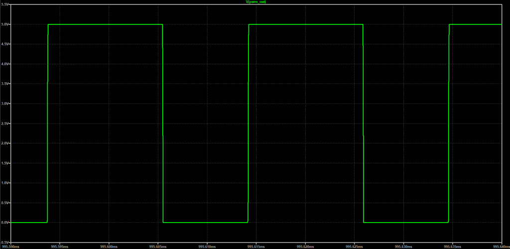 Given these calculations, I created a circuit for the PWM signal generation side of the buck converter utilizing a NE555 timer IC, one 100kΩ potentiometer, one 1kΩ resistor, one 47kΩ resistor, one 22kΩ resistor, one 3.3kΩ resistor, two 1N4138 diodes, one 100pF ceramic capacitor, one 30pF ceramic capacitor, and one 10pF ceramic capacitor. These values were chosen as they fit standard resistor and capacitor values for real components (and they were the values that I had access to) that came close enough to the design values when put in series (resistors) / parallel (capacitors), respectively. The schematic for the overall timing circuit and its resultant output waveforms for theoretical duty cycle of 0.583 and 0 are shown in the figures below (Figures 13-16):