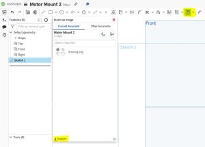 The first step to build the motor mount, is to open a new document on Onshape. When the workspace opens, we will create a new sketch, and use the front plane of the workspace to place objects and images.