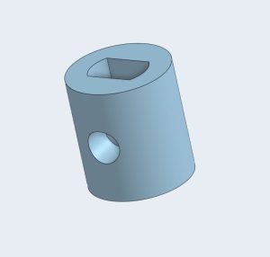 The dimensions used for this first design are not strictly following the dimensions of the motor shaft. This is due to the print variations of a 3D printer from model to model. The first design is printed and fitted on the servo motor to check the fitment. This print had a good fit on the servo motor’s shaft, but the holes on each side to fasten screws to firmly secure the hub to the motor were too big for the threads of the screw. This resulted in the screw unable to tap into the plastic hub. In addition, the holes were sitting too high on the hub, and the screws would only partially make contact with the motor’s shaft.  The dimensions of the hole to which the stepper motor shaft inserts into are satisfactory, but the diameter of the holes for the screws needed to be adjusted, along with the distance between the top of the hub and the holes.