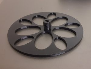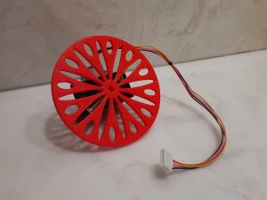 After attempting to tap threads into the holes on each prototype hub, it was determined that a hub with a hole with a diameter of 2.85mm is the best size for a firm fit between the hub and the screws. The change in position of the holes now allowed the screws to have full contact with the shaft of the motor. Having the optimal dimensions for the hub, the wheel portion of the piece is modeled, having a thickness of 3mm, and a diameter of 90mm. This model is then printed as the final design, and mounted onto the servo motor and mount: