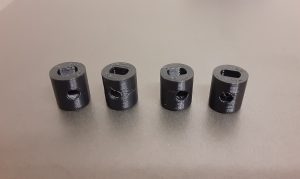 To solve this problem, four models were created which were exact copies of the original design, except that the diameter for the holes for the screws were adjusted to be smaller by 0.05 millimeters in diameter for each hub prototype, from 2.95mm to 2.80mm. The position of the holes were also tweaked. All four of these models were 3D printed and assessed for fitment and the ability to be tapped by the screws: